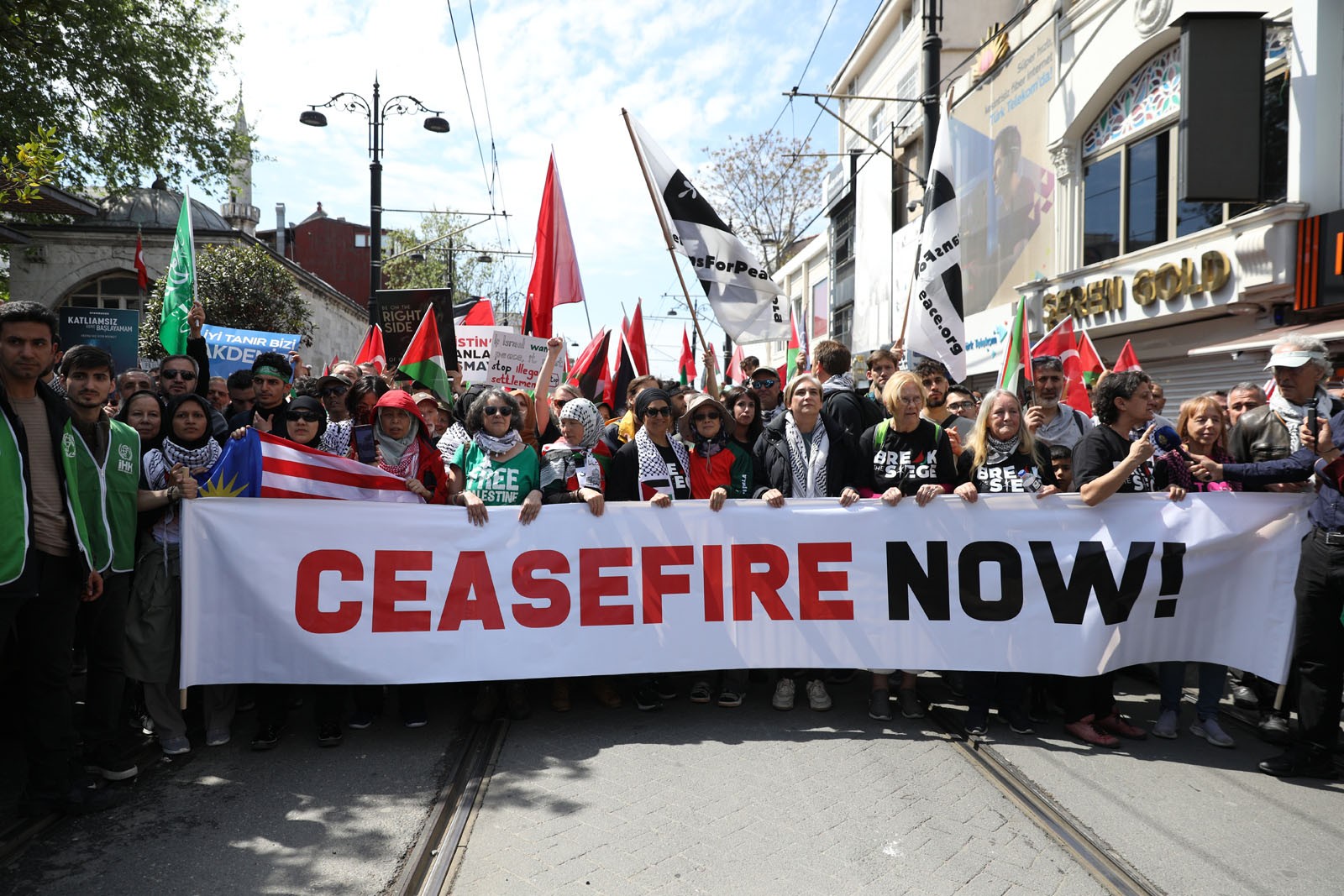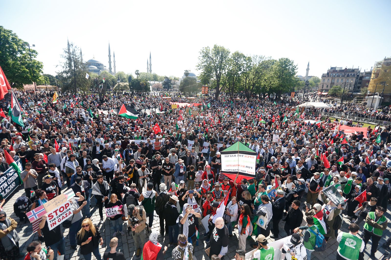 Yürüyüş eylemi, saat 14.00'da Beyazıt Meydanı'ndan başladı. On binlerce kişinin katıldığı yürüyüşte, Filistin’e destek mesajı verildi, işgalci İsrail'in Gazze'de altı ayı aşkın süredir sürdürdüğü yoğun saldırıları ve devam eden ablukası protesto edildi. Yürüyüşte, “Katil İsrail Filistin’den Defol, Katil İsrail işbirlikçi ABD, Free free Palestine” sloganları atıldı. Yürüyüş sırasında güzergâh üzerindeki vatandaşlar ve turistler de eyleme destek verdi. Katılımcılar, kortej halinde Ayasofya Camii Meydanı’na kadar yürüdü.