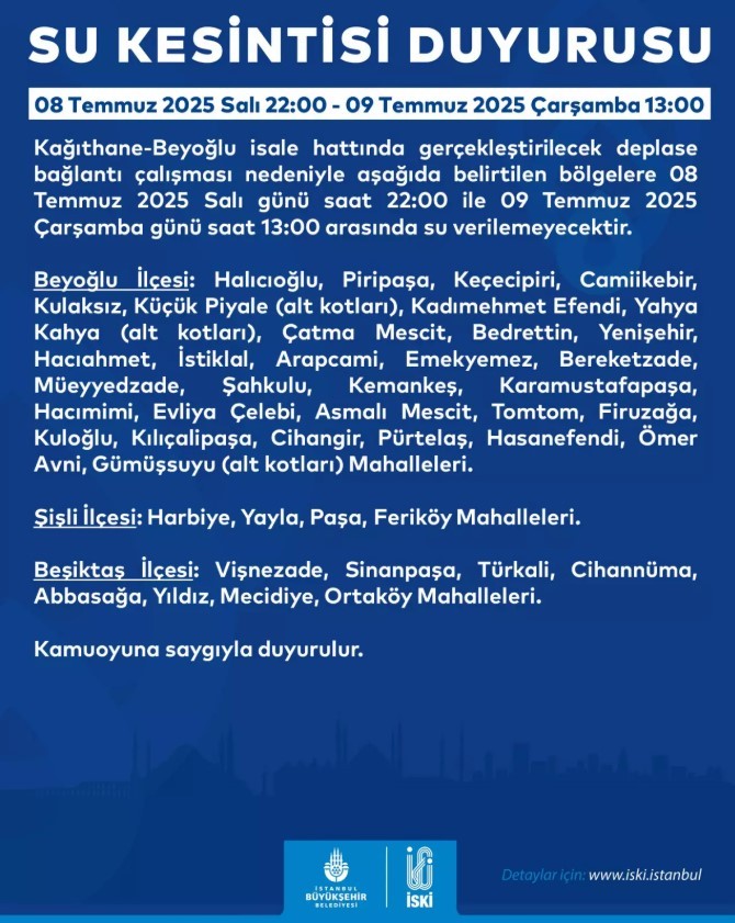 Yapılan açıklamaya göre, Beyoğlu, Şişli ve Beşiktaş'ta 8 Temmuz Salı günü akşam 22.00'dan başlayan kesinti 15 saat sürecek. Su kesintisinin 9 Temmuz Çarşamba günü saat 13.00 gibi sona ermesi bekleniyor.