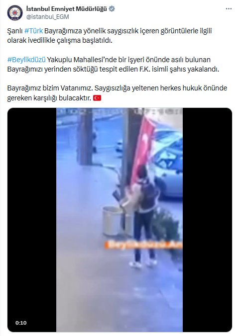 “Şanlı Türk Bayrağımıza yönelik saygısızlık içeren görüntülerle ilgili olarak ivedilikle çalışma başlatıldı. Beylikdüzü Yakuplu Mahallesi’nde bir işyeri önünde asılı bulunan Bayrağımızı yerinden söktüğü tespit edilen F.K. isimli şahıs yakalandı. Bayrağımız bizim Vatanımız. Saygısızlığa yeltenen herkes hukuk önünde gereken karşılığı bulacaktır.”