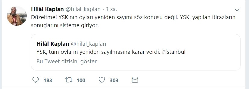 Ancak daha sonra yaptığı açıklamada bu iddiasına düzeltme yaparak "Düzeltme! YSK’nın oyları yeniden sayımı söz konusu değil. YSK, yapılan itirazların sonuçlarını sisteme giriyor." açıklaması yaptı.