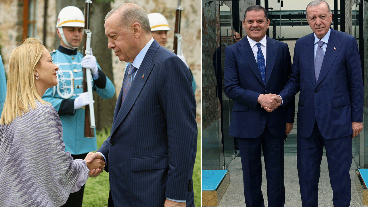 Cumhurbaşkanı Erdoğan, İtalya Başbakanı Meloni ve Libya Ulusal Birlik Hükümeti Başbakanı Dibeybe'yi Cumhurbaşkanlığı Dolmabahçe Çalışma Ofisi'nde ayrı ayrı resmi törenle karşılamıştı.
