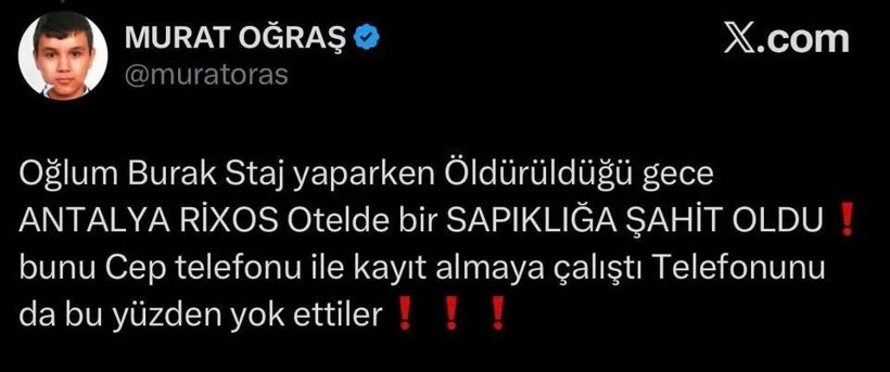 "Oğlum Burak, Rixos Otel'de katledildiği gece hangi sapıklığa şahit oldu? Saat 23:53'te cep telefonunu yok ettiler ve 12,5 yıldır bulunamıyor. Oğlum o sapıklığı kayıt altına almaya çalıştı, telefonu bu yüzden yok edildi!"