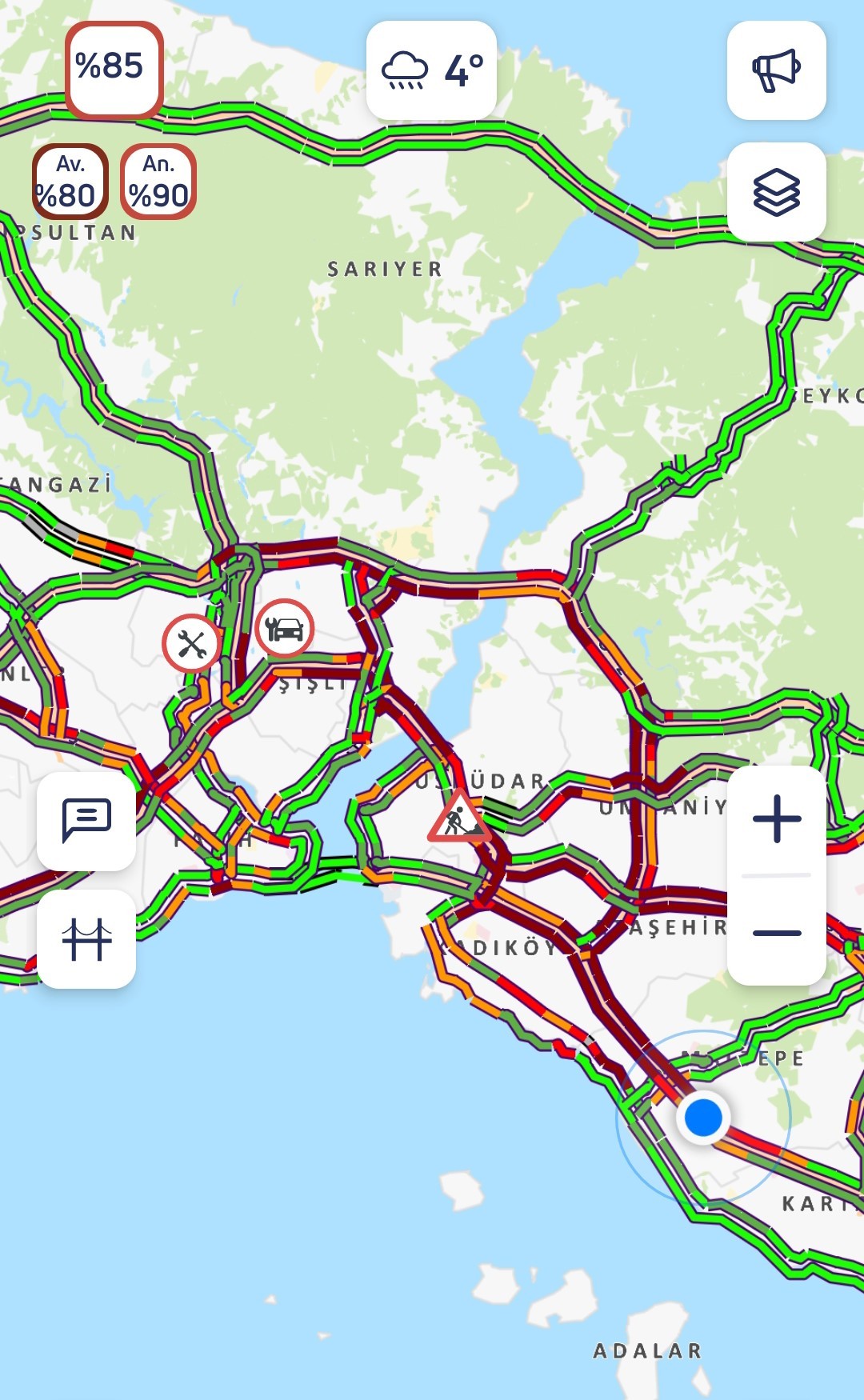 İBB Cep Trafik uygulamasında trafik yoğunluğu genel olarak yüzde 85 olarak ölçülürken Avrupa Yakası'nda yüzde 80, Anadolu Yakası'nda yüzde 90 olarak ölçüldü.