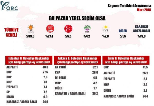 ORC Araştırma, 22-26 Mart tarihleri arasında 36 ilde 5620 seçmene “Bu pazar yerel seçim olsa” sorusunu yöneltti.