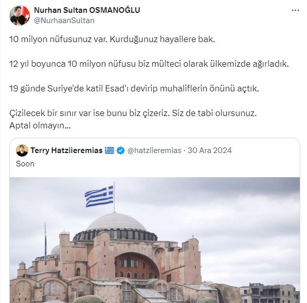 Nurhan Sultan Osmanoğlu paylaşımında, “10 milyon nüfusunuz var. Kurduğunuz hayallere bak. 12 yıl boyunca 10 milyon nüfusu biz mülteci olarak ülkemizde ağırladık. 19 günde Suriye'de katil Esad'ı devirip muhaliflerin önünü açtık. Çizilecek bir sınır var ise bunu biz çizeriz. Siz de tabi olursunuz. Aptal olmayın...” diyerek küstah Yunan’ı rezil rüsva etti.