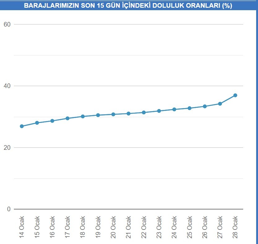 Bugün İSKİ tarafından kaydedilen son verilere göre İstanbul baraj doluluk oranı yüzde 34,22'ye ulaşmış durumda. Geçen yıl aynı gün ise baraj doluluk oranı yüzde 55,47 olarak kaydedilmişti. 2014 yılında İstanbul baraj doluluk oranı 28 Ocak tarihinde yüzde 32,55 olarak kaydedilmişti. Bu veri ise son on yılda günümüze en yakın veri olarak kayıtlara geçti.