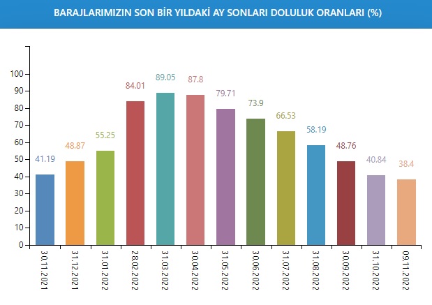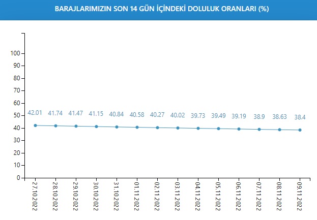 9 Kasım 2022 verilerine göre İstanbul'da baraj doluluk oranı yüzde 38.4 olarak kaydedildi.