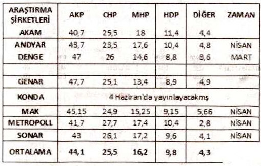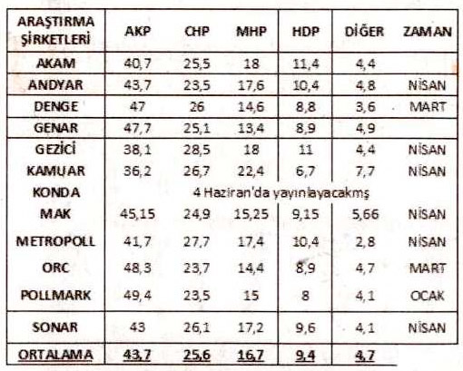 Aynı zamanda bir üniversitede İletişim Fakültesi'nde ders veren ve iletişim uzmanı olan yazar, araştırma şirketlerinin seçim anket sonuçlarını yazısında tablo halinde verdi.
