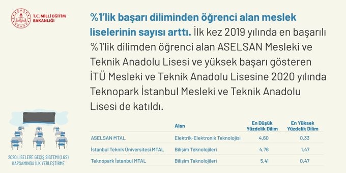 2020 LGS tercihlerinde başarılı öğrencilerin meslek liselerine daha fazla yöneldikleri MEB tarafıdan paylaşılan veriler arasında yer aldı. Yüzde 1'lik dilime giren öğrencilerin tercihleri arasında ASELSAN Mesleki ve Teknik Anadolu Lisesi, İTÜ Mesleki ve Teknik Anadolu Lisesi ve Teknopark İstanbul Mesleki ve Teknik Anadolu Lisesi yer aldı. Genel olarak da meslek liselerine yönelim 2019 yılına oranla yüzde 40 arttı.