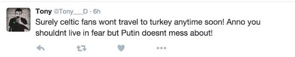 Türkiye'nin sınırlarını ihlal eden Rus uçağını düşürmesi ve Putin'in verdiği sert tepki Fenerbahçe'nin rakibi Celtic taraftarını korkuttu.