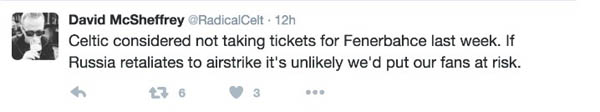 David McSheffrey: Celtic, Fenerbahçe maçı bileti satmamayı düşünmeli. Eğer Rusya bir hava saldırısı düzenlerse bu bizim taraftarlarımızı riske atar.