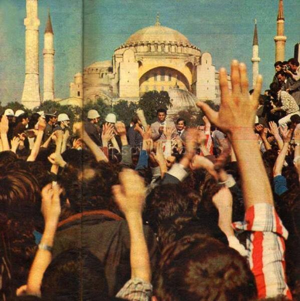 1976'da Erbakan Hoca'nın davetlisi olarak Türkiye'ye gelen efsane boksör Muhammed Ali Ayasofya'nın önünde konuşurken