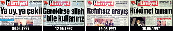 Türkiye’nin koalisyon hükümeti ile yönetildiği 1997’li yıllarda attığı manşetlerle siyaseti dizayn etme çabasına giren Hürriyet gazetesi, 04.03.1997 tarihinde Erbakan için “Ya uy, ya çekil” manşeti atarak hükümetin yıkılması için baskı yaptı. Üç ay sonra 12.06.1997 yılında “Gerekirse silah bile kullanırız” manşetiyle darbe çığırtkanlığı yapan Hürriyet, 30.06,1997’de bu kez “Hükümet tamam” diyerek siyaset üzerindeki derin operasyonunu tamamladı. Hükümetleri dizayn etme çabası ve alışkanlığı ortada olmasına rağmen, Cumhurbaşkanı Erdoğan’a mektup yazarak, ‘siyasete müdahale çabamız yok’ mesajı vermeye çalışan Aydın Doğan’ın, grubuna bağlı medya kuruluşlarında teröre verilen desteği inkar etmesi de dikkatlerden kaçmadı. Bakırköy Cumhuriyet Başsavcılığınca, Doğan Medya Grubu bünyesindeki basın kuruluşlarında yer alan bazı haberlerden dolayı grubun yetkilileri hakkında, ‘’terör örgütü propagandası yapmak’’ suçundan soruşturmanın yürütüldüğü süreçte Aydın Doğan’dan gelen bu açıklama, ‘günah çıkarma arayışı’ olarak yorumlandı.