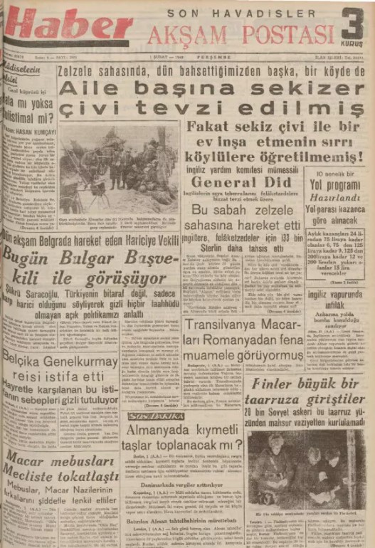 Erzincan depreminde yaklaşık 1 ay sonra 1 Şubat 1940 tarihinde yayınlanan gazetelerde CHP hükümetinin depremzedelere aile başına 8 çivi verdiği yazıldı.