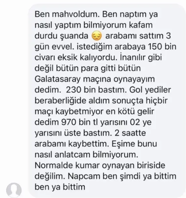 Galatasaray- Konyaspor maçına sanal bahis oynayan bir kişi, yaklaşık 1 milyon lira kaybettiğini belirtti. Sosyal medyada paylaşılan mesajında aracını sattıktan sonra elindeki tüm parayı maça yatırdığını anlatan kişi, kısa sürede büyük bir maddi kayıp yaşadığını ifade etti.