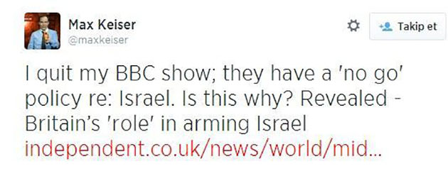 BBC'nin Gazze'ye karşı taraflı tutumunu protesto amacıyla önemli bir istifa geldi. Gazeteci Max Keiser, BBC'nin "İsrail'den asla bahsetme" şeklinde bir talimatı üzerine kurumundan istifa ettiğini duyurdu.