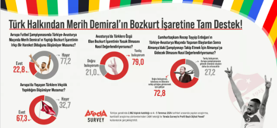 Areda Survey araştırma şirketi, Merih Demiral'ın Türkiye-Avusturya maçında yaptığı bozkurt işareti ve sonrasında yaşanan olaylarla ilgili bir araştırma gerçekleştirdi. Araştırmaya göre, Türk halkının yüzde 77,2'si Merih Demiral'ın yaptığı bozkurt işaretini ırkçı bir hareket olarak görmüyor. Yüzde 22,8'i ise bu fikre katılmıyor ve ırkçı bir hareket olarak değerlendiriyor. Yüzde 79'u bu işaretin Avusturya'da yasak olmasını yanlış bulurken yüzde 67,3'ü Avrupa'da yaşayan Türklere karşı ırkçılık yapıldığını savunuyor.