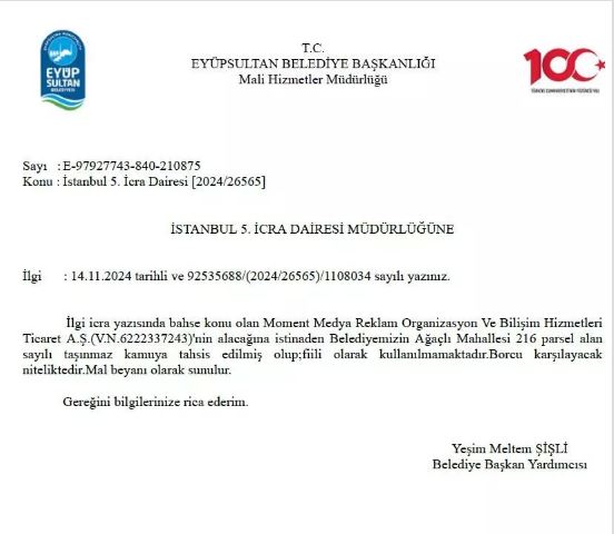 Eyüpsultan Belediyesi, Moment Medya Reklam Organizasyonu ve Bilişim Hizmetleri Ticaret A.Ş’ne verilen matbaa işinin 29 Aralık 2023 tarihinde tamamlanarak teslim edildiği, ancak Belediye’nin firma sahibine herhangi bir ödeme yapmaması üzerine mahkemeye başvurarak belediyeden alacağı 4 milyon TL’nin tahsil edilmesini istedi.