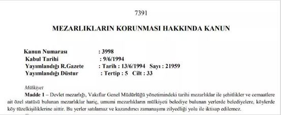 3998 sayılı Mezarlıkların Korunması Hakkında Kanun'un 1. maddesi'nde, 'Devlet mezarlığı, Vakıflar Genel Müdürlüğü yönetimindeki tarihi mezarlıklar ile şehitlikler ve cemaatlere ait özel statüsü bulunan mezarlıklar hariç, umumi mezarlıkların mülkiyeti belediye bulunan yerlerde belediyelere, köylerde köy tüzelkişiliklerine aittir. Bu yerler satılamaz ve kazandırıcı zamanaşımı zilyedliği yolu ile iktisap edilemez.'' bilgisi yer almaktadır.
