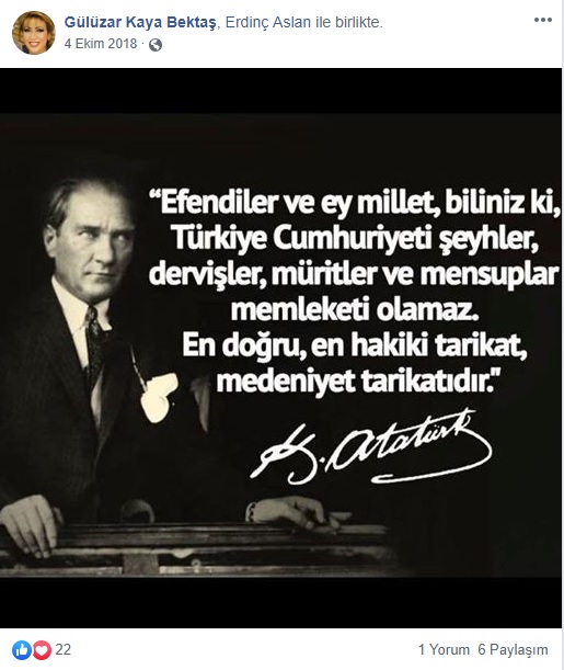 Tapınırcasına sevgi gösterdiği Atatürk için de Bektaş’ın tuhaf cahillikler sergilediği görülmektedir. 4 Ekim 2018’de Atatürk’ün “..Türkiye Cumhuriyeti şeyhler, dervişler, müritler ve mensuplar memleketi olamaz...” şeklinde bir sözünü paylaşmaya kalkmakla kendisini gülünç duruma düşürmüştür. “Meczup” ifadesi yerine son derece manasız biçimde “mensup” ifadesini kullanması, paylaşımı ayık kafayla yapıp yapmadığını düşündürmektedir.