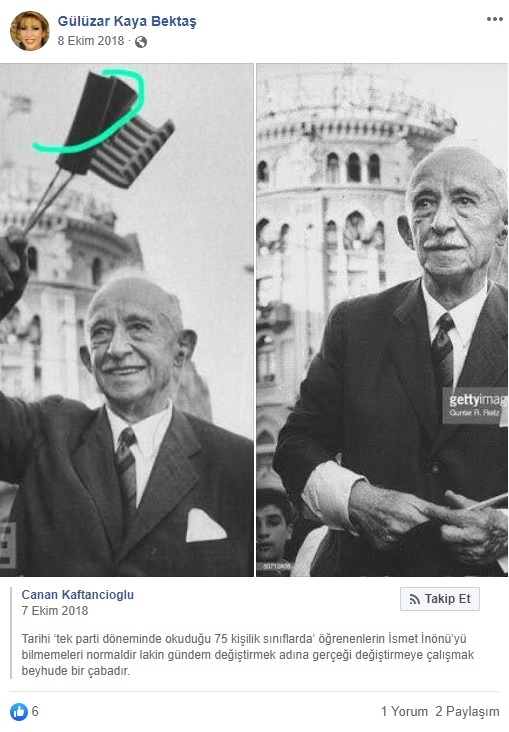 CHP’li mevki sahiplerinin sergilediği korkunç bir cehalet ise, İnönü ve Amerika konusunda görülmektedir. İnönü’nün Amerikan bayrağı sallamakla alakası olmadığı dolayısıyla Amerika “yalakalığı” gibi şeylerle itham edilemeyeceği imasında, 7 Ekim 2018’de Canan Kaftancıoğlu paylaşım yapmış ve 8 Ekim’de bunu Bektaş da kendi hesabında paylaşmıştır.