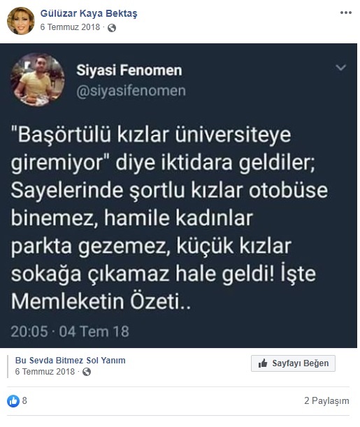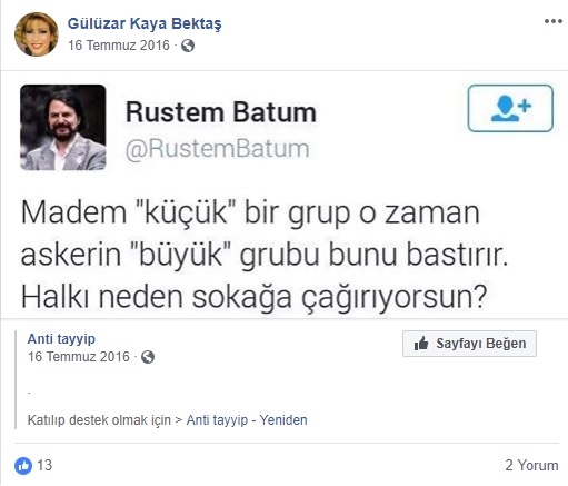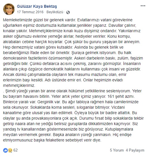 Ancak Gülüzar Bektaş’ın skandalları burada da bitmiyor. O, 15 Temmuz zamanı halkın sokağa çağrılmasına karşı paylaşım yapmış, camilerde selâ okunması ve sokaklarda tekbir getirilmesinden çok rahatsız olup derhal bitirilmesini isteyerek bunların kutuplaşmaya meydan verdiğini ileri sürmüştü.