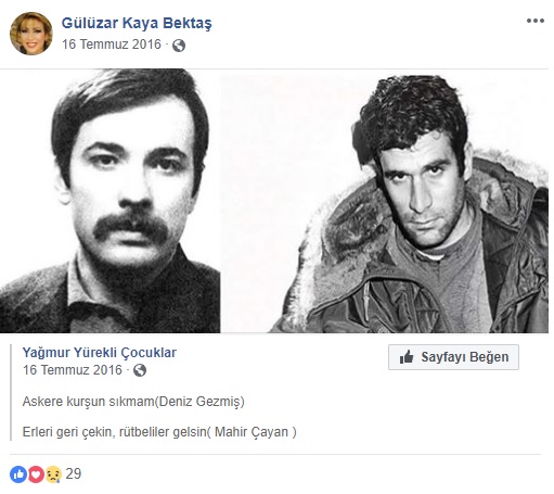 Ayrıca o, halkın vahşice kıyıma uğratılmasına doğru düzgün ses vermezken, Deniz Gezmiş’ten “askere kurşun sıkmam” sözü paylaşarak sanki üzerine mermi yağdırılan, tanklar sürülen, bombalar atılan halk değil de mağdur ve mazlum olan darbecilermiş gibi onları koruyup kollamanın derdine düşmüştü.