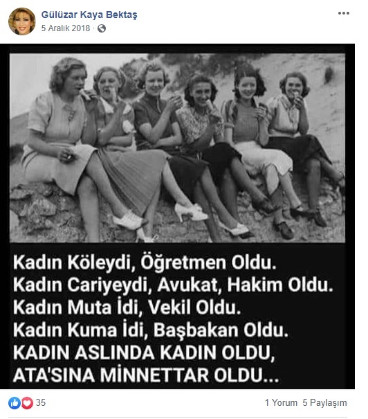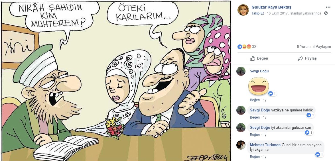 Paylaşımlarından birisinde rahatsız edici görüntüde çizilmiş imam, üzgün bir gelin ve çok eşli duyarsız bir adam resmediliyor. Nitekim Bektaş, 29 Eylül ve 5 Aralık 2018 tarihlerinde yaptığı paylaşımlarda kadının Cumhuriyet öncesi sadece köle, muta, kuma ve cariye olduğunu söyleyerek zift gibi kopkoyu bir cehalet sergiliyor.