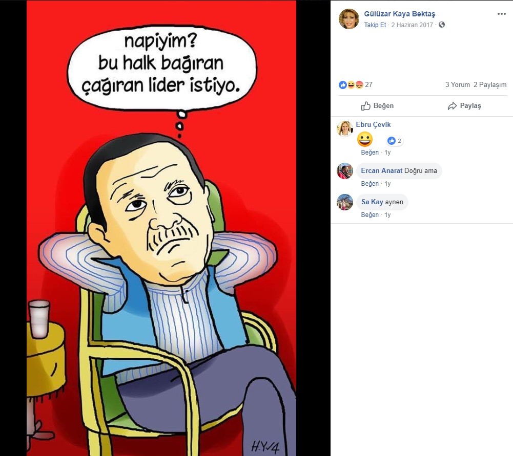 Halkı aşağılayıcı paylaşımlara da yer veren Bektaş, paylaştığı bir karikatürde Erdoğan sanki sırf “bağırıp çağırıyor” diye oy alıyormuş imasına da yer vermektedir.