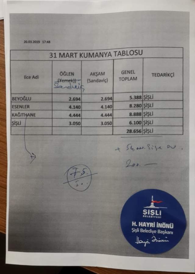 CHP’li Şişli Belediyesi iş emrine göre, Beyoğlu ilçesi için 5.388, Esenler ilçesi için 8.280,Kağıthane için 8.880, Şişli ilçesi için de 6.100 kumanya hazırlanıp, sandıkta görev yapan CHP’li gözlemcilere teslim edilecek.