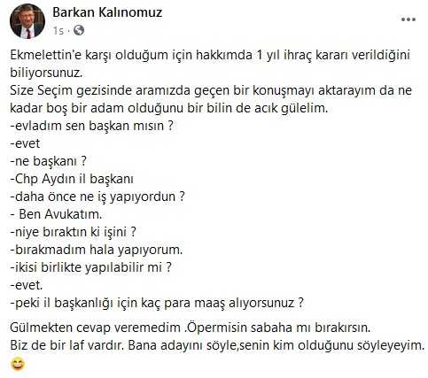 Eski CHP İl Başkanı Barkan Kalınomuz sosyal medya hesabından Ekmeleddin İhsanoğlu ile arasında geçen diyalogu anlattı.