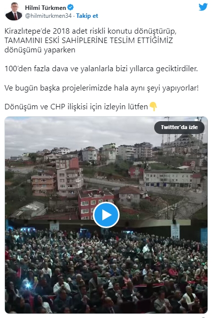"Kirazlıtepe’de 2018 adet riskli konutu dönüştürüp, TAMAMINI ESKİ SAHİPLERİNE TESLİM ETTİĞİMİZ dönüşümü yaparken 100’den fazla dava ve yalanlarla bizi yıllarca geciktirdiler. Ve bugün başka projelerimizde hala aynı şeyi yapıyorlar! Dönüşüm ve CHP ilişkisi için izleyin lütfen."