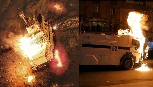 Olaylarda en az iki zırhlı araç ve bir toma atılan molotof kokteylleriyle yandı.