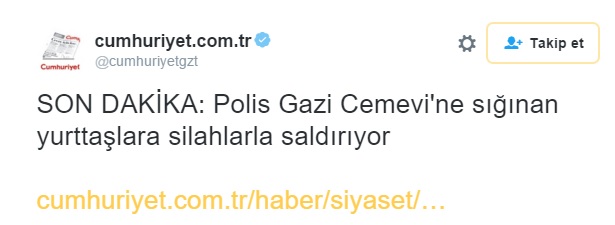 Bu basın yayın organlarının başında da elbette son zamanlarda bulabildiği bütün terör örgütlerine destek veren Cumhuriyet gazetesi geldi. Paralel yapı ve PKK’ya olan desteğini artık gizleme gereği bile duymayan Cumhuriyet, polise ateş eden ve cemevini harabeye çeviren teröristlerin eylemini “Polis Gazi Cemevi’ne sığınan yurttaşlara silahlarla saldırıyor” diyerek okuyucularına duyurdu.
