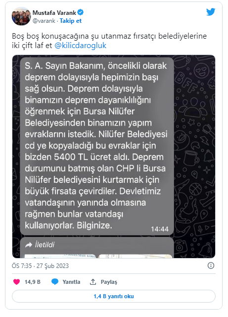 Konuya ilişkin Sanayi ve Teknoloji Bakanı Mustafa Varank'tan da bir açıklama geldi. Kendisine iletilen bir mesajı paylaşan Varank, "Boş boş konuşacağına şu utanmaz fırsatçı belediyelerine iki çift laf et Kılıçdaroğlu" ifadelerini kullandı.