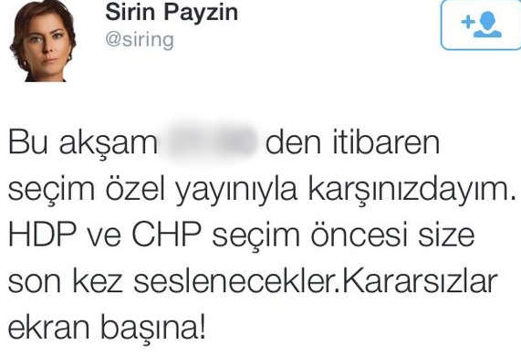 Payzın, sosyal medya hesabından programının duyurusunu yaptığı paylaşımda ''HDP ve CHP seçim öncesi size son kez seslenecekler. Kararsızlar ekran başına'' diyerek 'karasız' seçmeni terör örgütü PKK'nın desteklediği HDP ve CHP'ye oy vermeye davet etti.