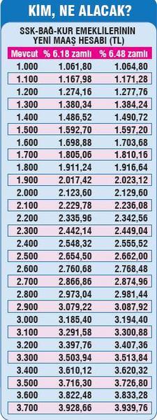 Eğer zam oranı yüzde 6.48 olarak gerçekleşirse, en düşük maaş 2000'den önce emekli olan SSK'lılarda bin 402 liradan bin 493 liraya, 2000'den sonra emekli olan SSK'lılarda ise 827,62 liradan 881,25liraya yükselecek. Taban maaş; Bağ-Kur esnaf emeklilerinde bin 184 liradan bin 260 liraya, Bağ- Kur tarım emeklilerinde 875,50 liradan 932,23 liraya çıkacak. Temmuz zammı yüzde 6.48 olarak gerçekleşirse, halen bin 500 lira olan maaş bin 597 lira 20 kuruşa ulaşacak. 2 bin lira olan maaş 2 bin 129 liraya, 2 bin 500 lira olan maaş da 2 bin 662 liraya yükselecek.