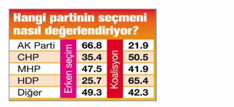 Aynı soruya en yüksek oranda 'Erken seçim olur' diyen seçmen yüzde 66.8 oranında AK Parti'ye oy veren seçmen oldu. Erken seçim olabileceği yönünde görüş bildiren ikinci en yüksek oransa yüzde 47.5 ile MHP'ye oy veren kesimdi. Olası bir koalisyon kurulabileceği yönünde düşünce belirten HDP'lilerin oranı yüzde 65.4 ile ilk sırada yer alırken, koalisyon olabileceğine inanan CHP'lilerin yüzdesi 50.5 düzeyindeydi.