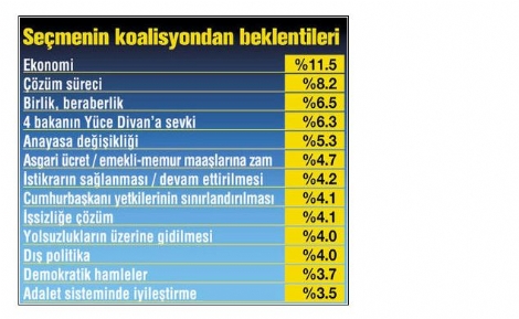 ANDY-AR'ın, 'Kurulacak bir koalisyonun yapmasını istediğiniz temel icraatlar neler?' sorusuna seçmenin verdiği ilk cevap 'Ekonomik hamleler' oldu. Bunu sırasıyla 'Çözüm süreci devam etmeli', 'Birlik, beraberlik ve birleştirici olunmalı' ve '17-25 Aralık'a ilişkin tekrar soruşturma yapılması gerektiği' izledi. Seçmenin beşinci isteğiyse, Anayasa değişikliği oldu.