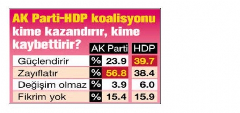Bir başka koalisyon modeli olan AK Parti-HDP koalisyonunun kimi güçlendirip kimi zayıflatabileceği de seçmene soruldu. Ankete katılanların yüzde 56.8'i böyle bir koalisyonun AK Parti'yi zayıflatacağını dile getirirken, yüzde 23.9'u güçlendireceğini söyledi. Aynı soruya cevap verenlerin yüzde 39.7'siyse bu koalisyonun HDP'yi güçlendireceğini açıkladı. Zayıflatacağını söyleyenlerin sonucu da yüzde 38.4 çıktı.