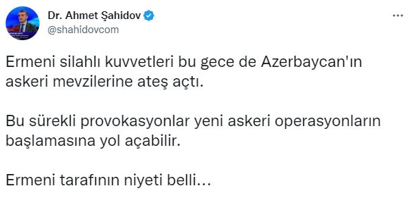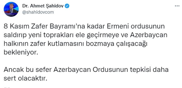 Şahidov paylaşımında, “Ermeni silahlı kuvvetleri bu gece de Azerbaycan'ın askeri mevzilerine ateş açtı. Bu sürekli provokasyonlar yeni askeri operasyonların başlamasına yol açabilir. Ermeni tarafının niyeti belli. 8 Kasım Zafer Bayramı'na kadar Ermeni ordusunun saldırıp yeni toprakları ele geçirmeye ve Azerbaycan halkının zafer kutlamasını bozmaya çalışacağı bekleniyor. Ancak bu sefer Azerbaycan Ordusunun tepkisi daha sert olacaktır” ifadelerini kullandı.