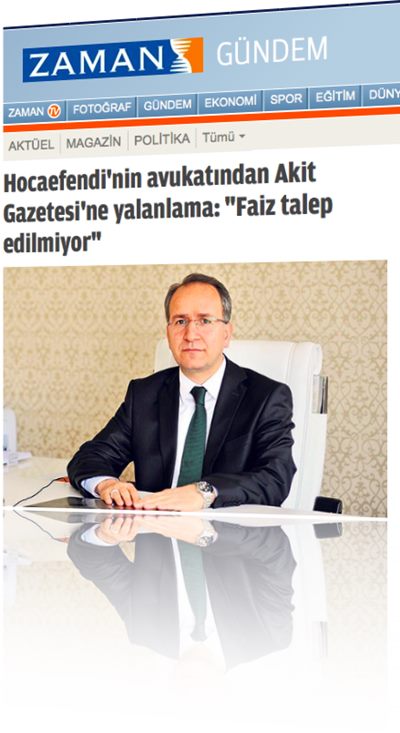 Bu konuyla ilgili geçtiğimiz Pazar günü Akit gazetesinde, “Gülen de faiz istiyor” başlığıyla yayınlanan haberde, Fetullah Gülen’in Akit gazetesine açtığı davalarda “faiz” istediği dava dosyaları yayınlandı. Belgelerde apaçık Gülen’in davalarda faiz istediği görülüyordu ama buna rağmen Fetullah Gülen’in avukatı Nurullah Albayrak ise bugün Gülen örgütünün yayın organı Zaman’a verdiği görüşünde, “Gülen’in istediği davalarda faiz talebi yok” dedi. Fetullah Gülen’in, “faiz” istediğini gösteren ortada dava dosyası yani belgeler olmasına rağmen avukatı Nurullah Albayrak tarafından “yalanlanması” anlaşılamadı.