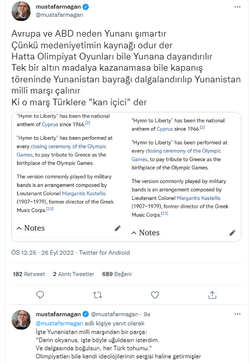 Mustafa Armağan mesajının devamında Yunanistan milli marşındaki hadsiz ifadeleri aktardı: