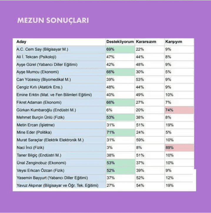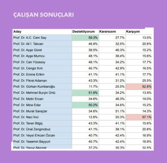 Öğrenciler yüzde 70,4 oranında Prof. Dr. Mine Eder'i desteklerken, çalışanların anketinden yüzde 59,3 oranında Prof. Dr. A. C. Cem Say birinci çıktı. Mezunlarda ise Yüzde 71 oy ile Mine Eder birinci çıktı.