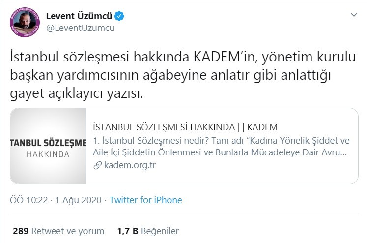 Sosyal medya hesabından KADEM'in açıklamasına paylaşan Üzümcü "İstanbul sözleşmesi hakkında KADEM’in, yönetim kurulu başkan yardımcısının ağabeyine anlatır gibi anlattığı gayet açıklayıcı yazısı." ifadelerini kullanması pes dedirtti.