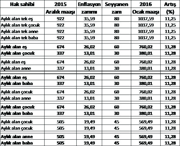 Hazırladığımız tablodan da anlaşılacağı üzere emekli aylıklarına 2016 yılı Ocak döneminde kümülatif olarak ortalama yüzde 11 oranında zam yapılmış olacak.