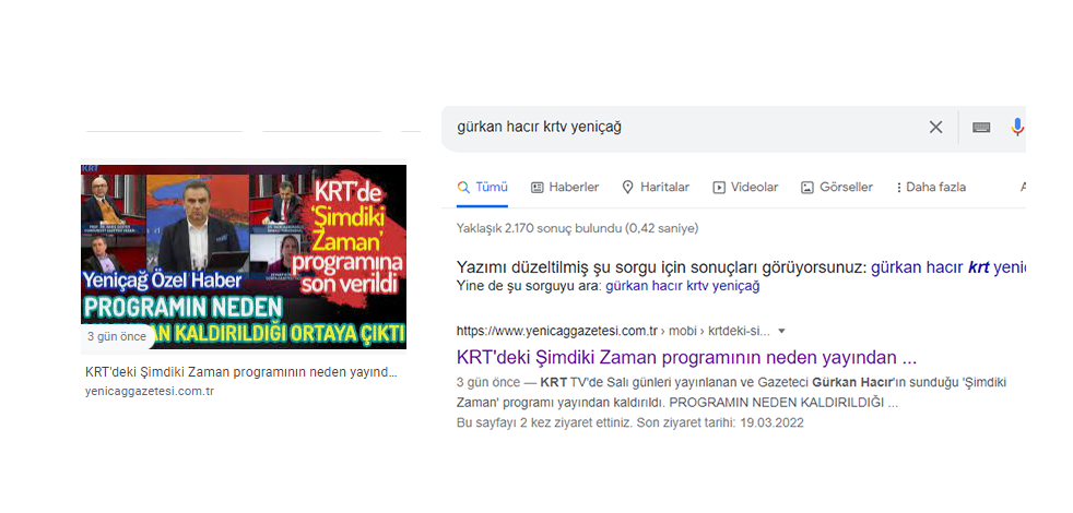 Öte yandan Meral Akşener’in gazetesi Yeniçağ’ın konuya ilişkin dikkat çeken bir gelişme tespit edildi. Programın yayından kaldırılmasını “Yeniçağ Özel Haber” başlığıyla bundan tam 3 gün öncesinde bir habere imza attı. Haberde, “KRT’de Şimdiki Zaman programına son verildi” denilerek tüm ayrıntılara yer verildi. Google taramalarında çıkan ancak Yeniçağ’ın sitesinden görülmeyen haberin, Meral Akşener tarafından kaldırtıldığı öğrenildi.