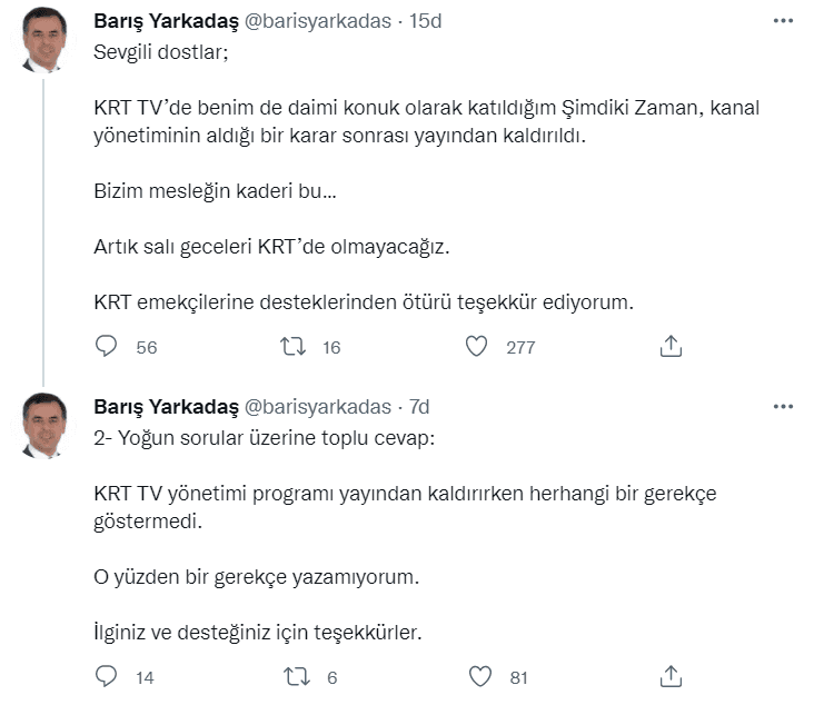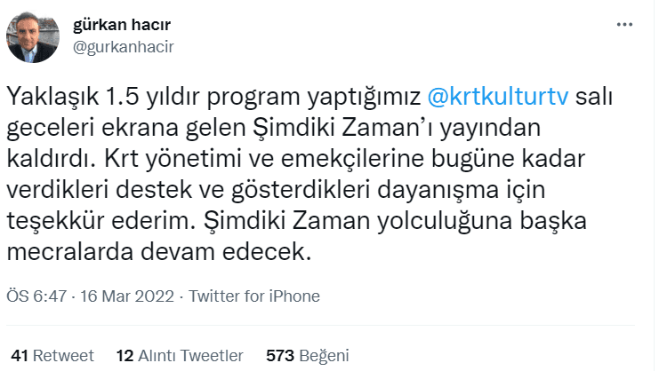 "Yaklaşık 1.5 yıldır program yaptığımız @krtkulturtv salı geceleri ekrana gelen Şimdiki Zaman’ı yayından kaldırdı. Krt yönetimi ve emekçilerine bugüne kadar verdikleri destek ve gösterdikleri dayanışma için teşekkür ederim. Şimdiki Zaman yolculuğuna başka mecralarda devam edecek."