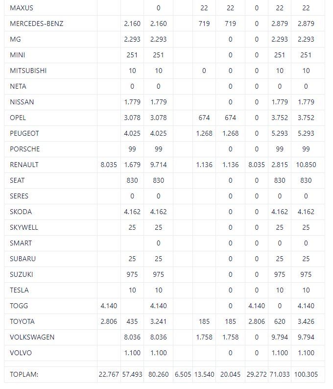 Toplam 55 markanın yer aldığı ODMD listesinde mayıs ayında Smart, Seres, Neta ve Aston Martin hariç tüm markaların satış yaptığı görüldü.