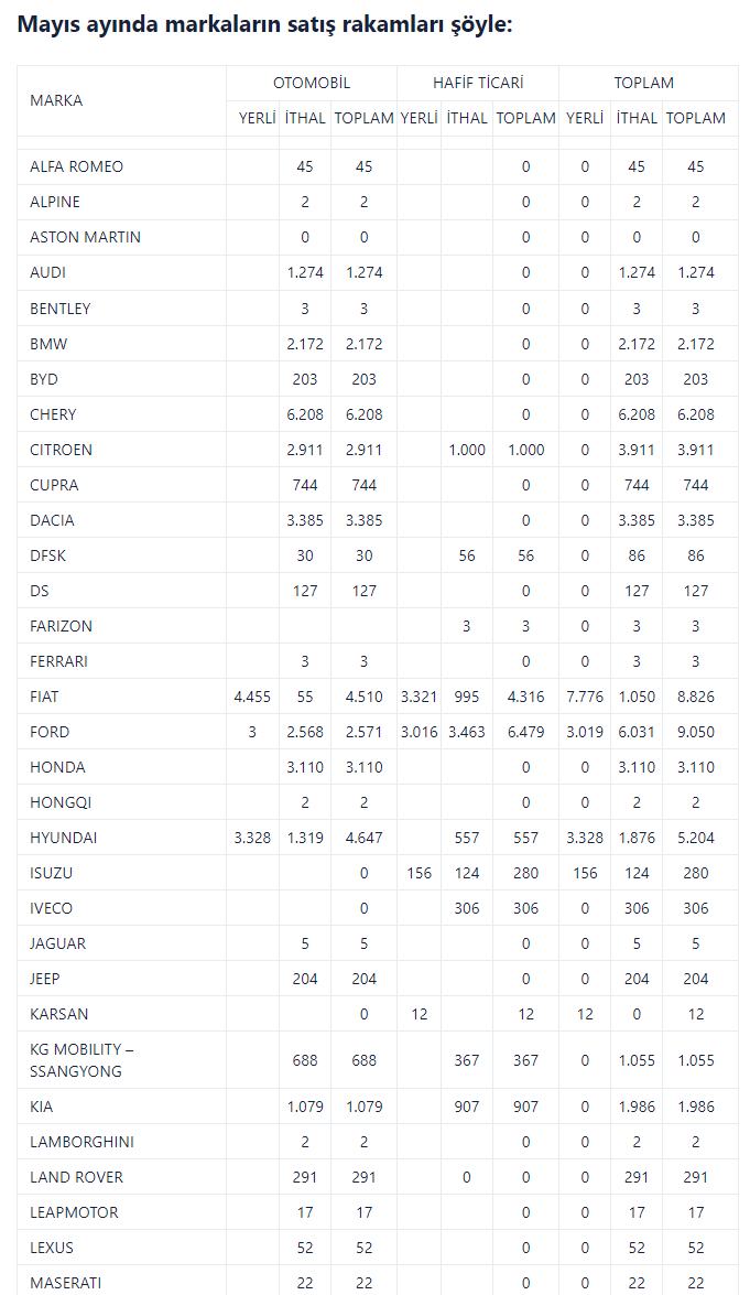 Mayıs ayında binek ve hafif ticari olmak üzere toplam satışlarda 10 bin 850 adetle Renault ilk sırayı aldı. Onu 9 bin 794 satışla Volkswagen ve 9 bin 50 adetle Ford takip etti.